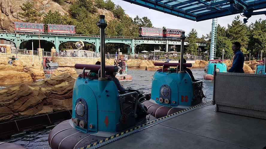 At the end of the ride the boats reverse in, spin around, and join the conga line in the station.
