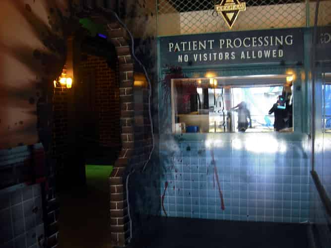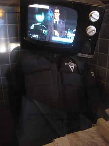 As you first enter you reach the patient admissions counter. This guard is having a bad day. A TV has been smashed over his head, conveniently playing news stories about the takeover of the asylum by the baddies.