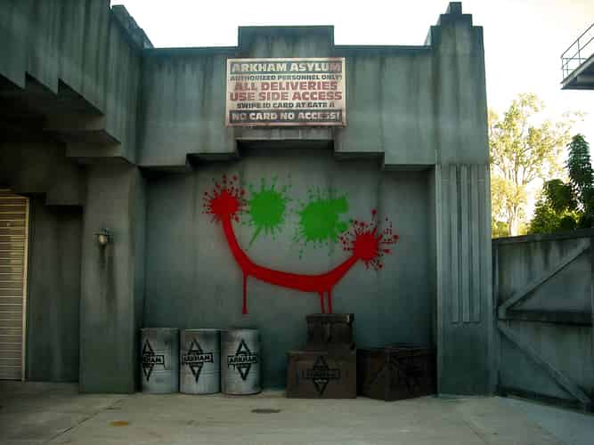 The story of the ride is that the intmates have taken over the Ayslum. The Joker is the ringleader, and has certainly left his mark.