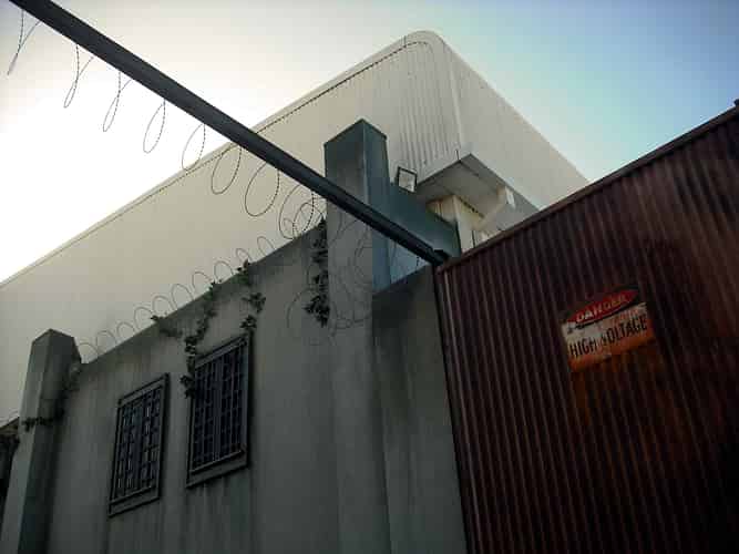 The old Lethal Weapon queue courtyard has been turned into the back of house/excercise yard of Arkham Asylum.