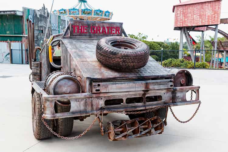 This Mad Max inspired car sits outside the ride for a photo op.