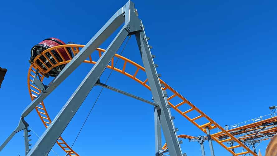 The ride is a new variant on the standard design, featuring a fan turn at the midpoint of the layout rather than an elevated flat section.