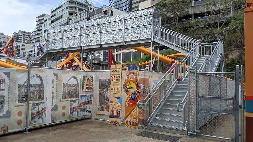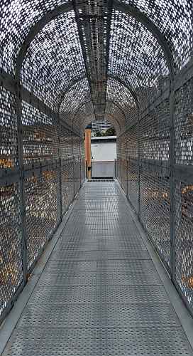 To enter, riders head up another flight of stairs over this galvanised steel bridge.