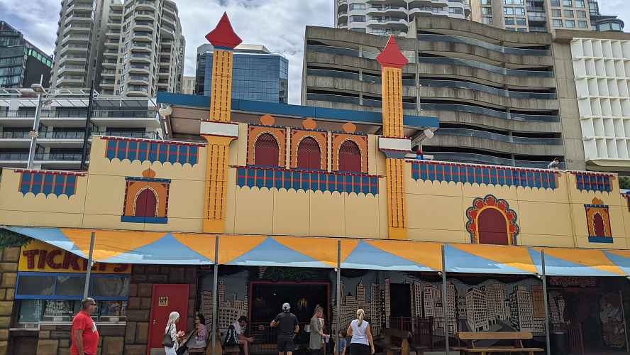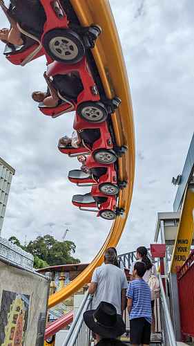 The first half of the ride sits on the roof of the dodgems building, which previously held the Tumble Bug ride.