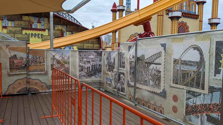A small queue area is in the middle of the ride, with photos of all three versions of the Big Dipper printed on banners.