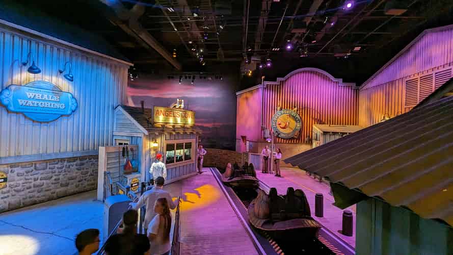 The load area. From here you head up a short lift hill, followed by a brief section in daylight. Following that you head back indoors through a brief dark ride section, before the ride follows the standard Maurer SC2000 spinning coaster layout.