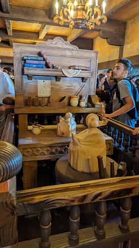 The queue heads through Geppetto's workshop.