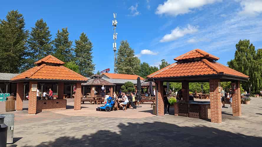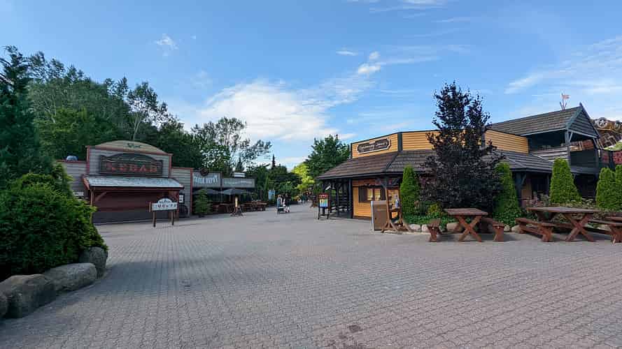 A panorama of the entry plaza, framed by DrageKongen and Piraten.