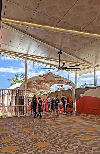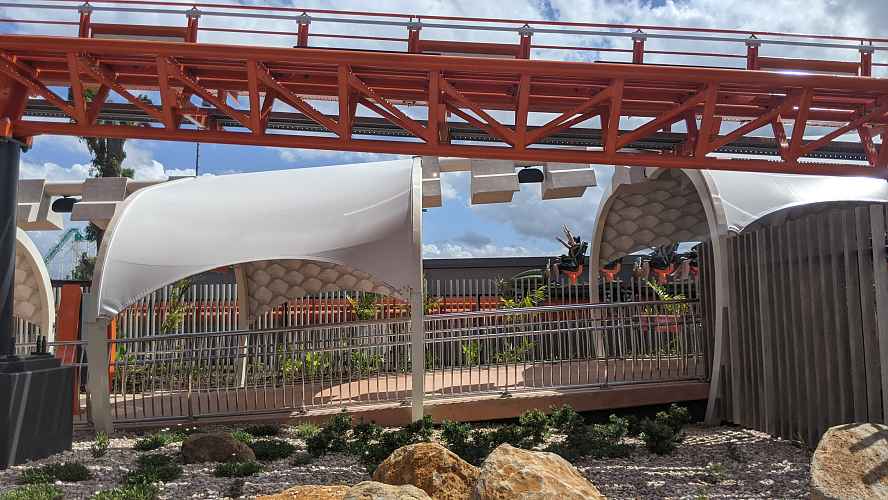 The station is spacious, with the entry host able to batch three trains ahead of time by directing guests to stand on the dots.
