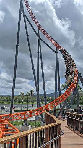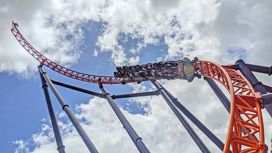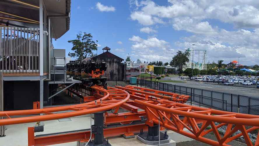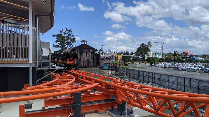The train coasts backwards down the launch track, when a powerful kick from the 2nd launch boosts the train up the reverse spiral.
