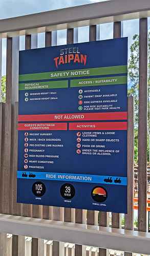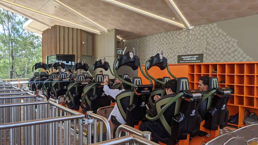 The safety video plays on overhead screens. There are 10 rows on one train, each seating two riders. The Tailwhip equipped train has only 9 rows, and the load gates are programmed to keep the gate for row 10 closed when that train is parked.