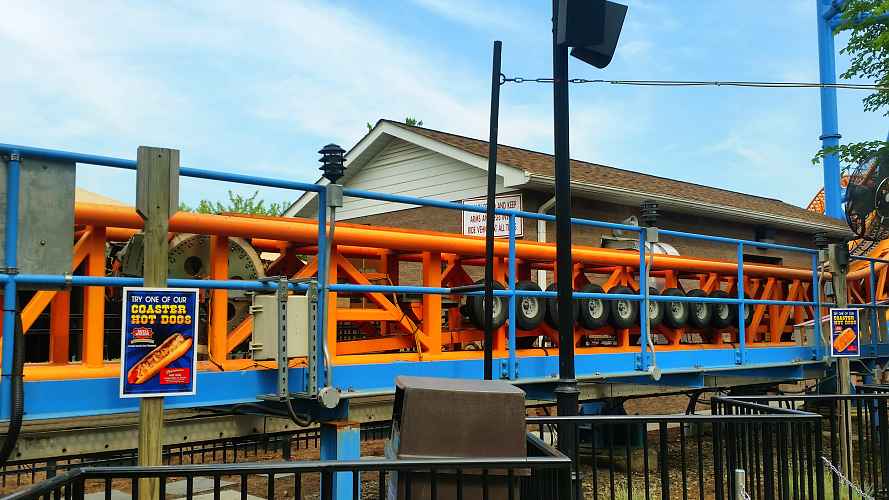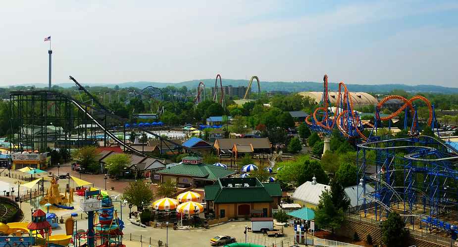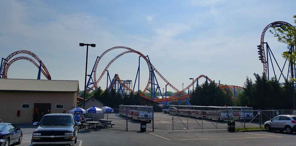 Looking over the Boardwalk to Tidal force and Fahrenheit and Wild Mouse. Rising in the distance is Great Bear, Storm Runner, and Skyrush.