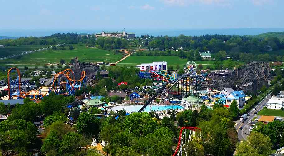 From left to right; Fahrenheit, Wildcat, the Laff Trakk building, the Coastline Plunge slides, Ferris Wheel and Lightning Racer. In the foreground is Tidal Force, the Shore wave pool, and Sidewinder. In the distance on the hill is Hotel Hershey.