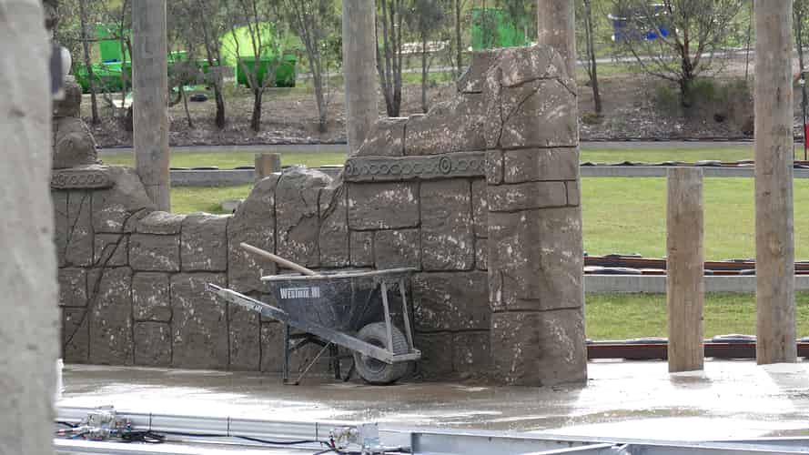 Over the course of a month, a team of rockwork artists transformed ordinary brick walls and columns into ancient temple ruins.