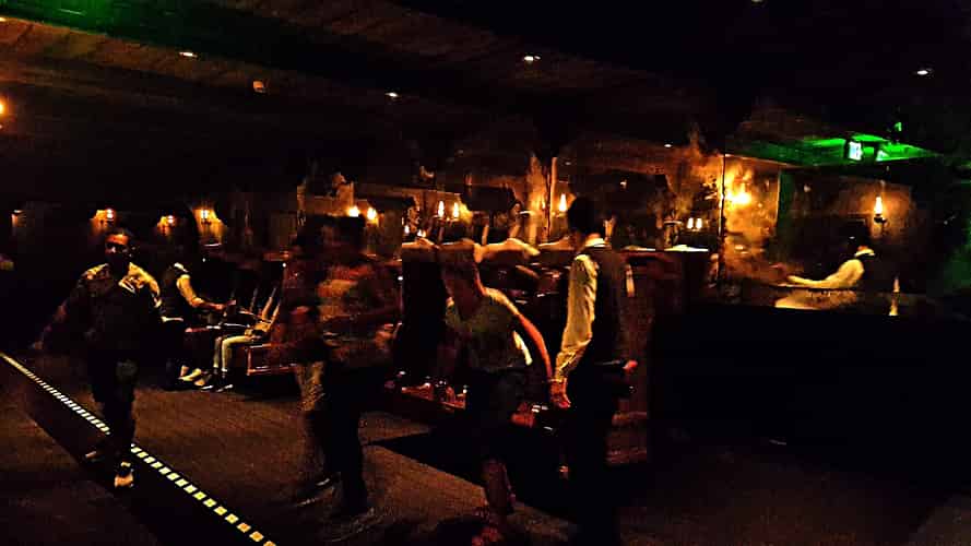 Guests board in the "Room of Requirement", a place in the castle that fills itself with whatever the user feels they need....In this case a non stop procession of "enchanted bench" ride vehicles.