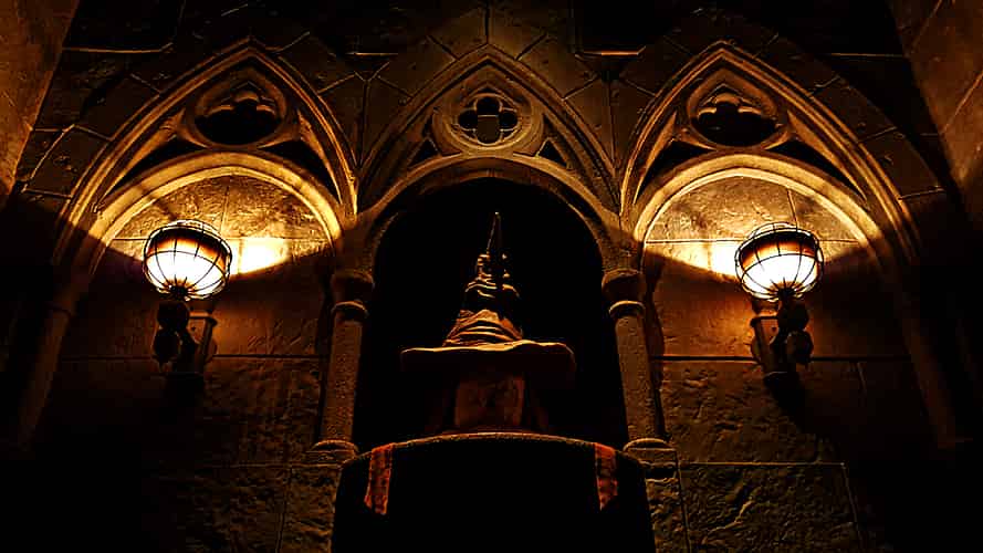 As you near the boarding area, the "Sorting Hat" delivers the safety spiel for the ride in poem form.