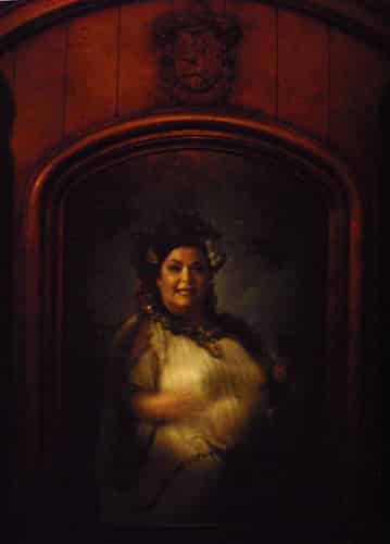 The 'fat lady' portrait (portrayed by Dawn French) guards the entrance to the Gryffindor common room. Gryffindor is one of the 4 houses at Hogwarts, and the one Ron, Harry and Hermione belong to.
