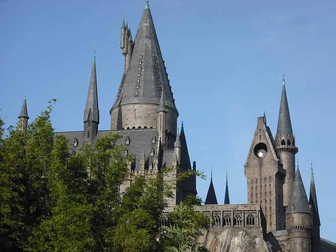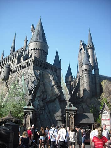 The queue then enters a classroom, and Harry, Ron and Hermione appear from underneath an invisibility cloak. They warn you your visit to the castle will involve a 3 hour lecture on the history of Hogwarts. They however tell you that there is a quiddich match on, which will be far more interesting, and they plan on flying you there to see it!