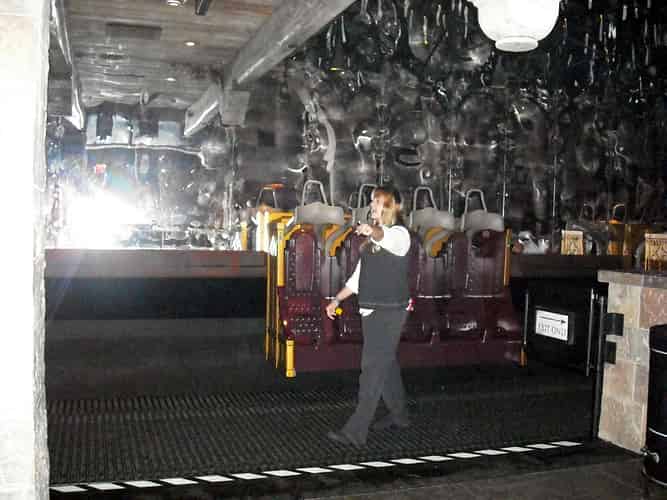 Loading of the ride takes place in the room of requirement. The benches move along continuously and guests board on a moving conveyor belt, with the benches attached to the end of robotic arms that run along a track through the building. However this robotic mechanism is hidden from view behind a wall in the loading station. The result is 4 minutes of being tossed and turned and flipped through a chaotic dark ride in a manner normal tracked rides cannot achieve.