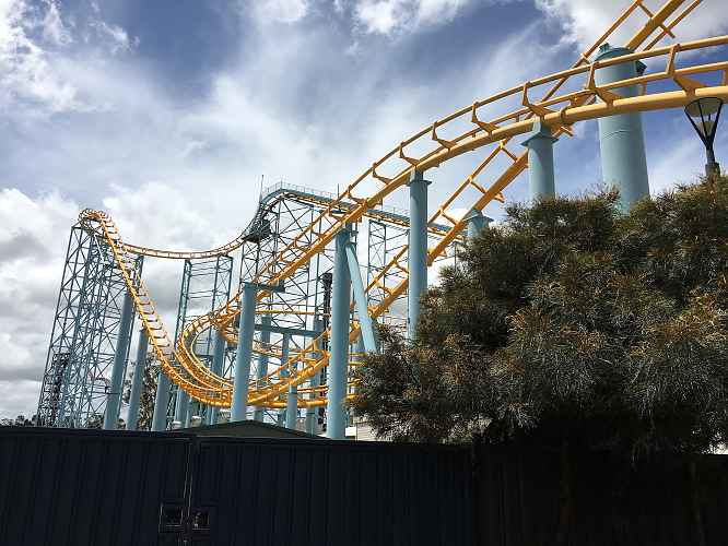 Dreamworld is currently repainting Hot Wheels SideWinder from yellow track and blue supports to a new colour scheme with aqua track and white supports.