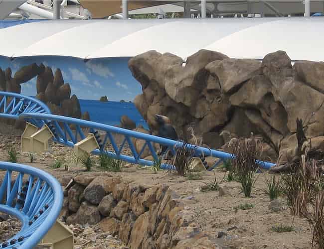 The first part of the ride is well hidden. After being launched straight from the station, guests whip around a helix over a rock pool, before hopping over the launch track and swerving around into a cave.