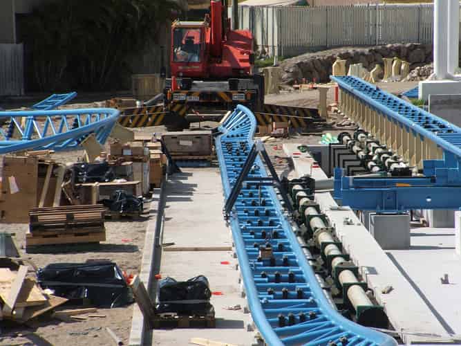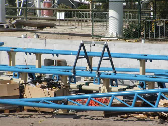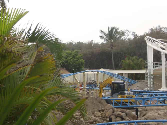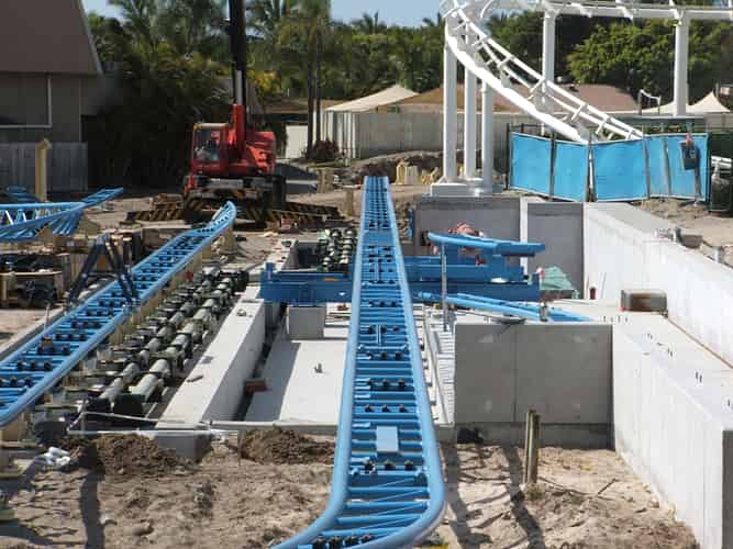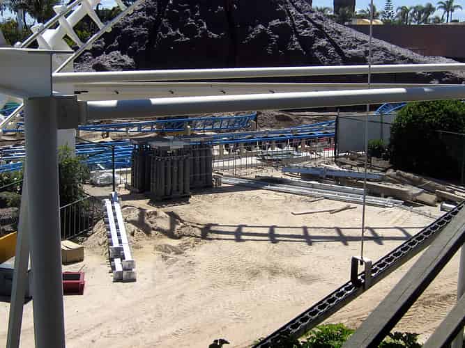 Work now shifts to the building associated with the ride, starting with the bearers for the station floor.