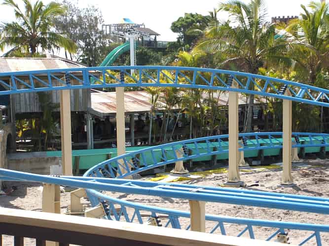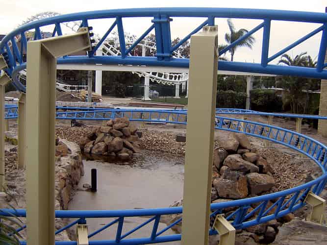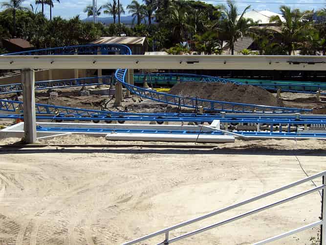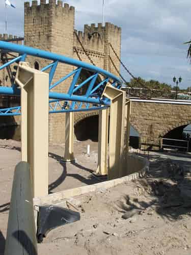 Part of the 270 degree turn that follows the first launch. Interestingly it runs in a depression in the ground. A comparison could almost be drawn with Furius Baco, another Intamin launch coaster known for fast, low to the ground turns.