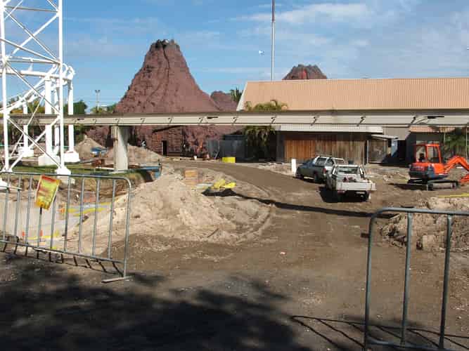 The vehicle entrance to the site. Note the low clearance the monorail track imposes.