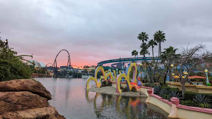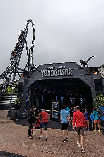A clash of themes, with VelociCoaster passing close to Hogsmeade Village.