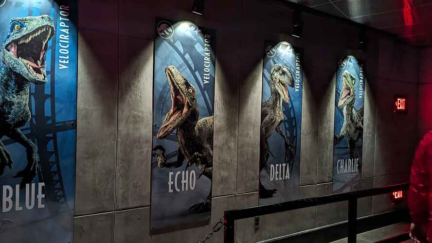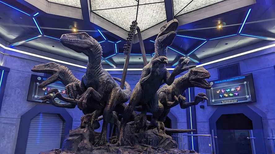 This statue hints at the theme of the ride....Coaster meets velociraptors.