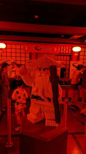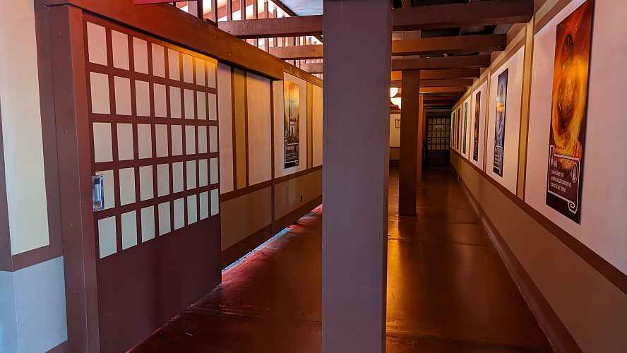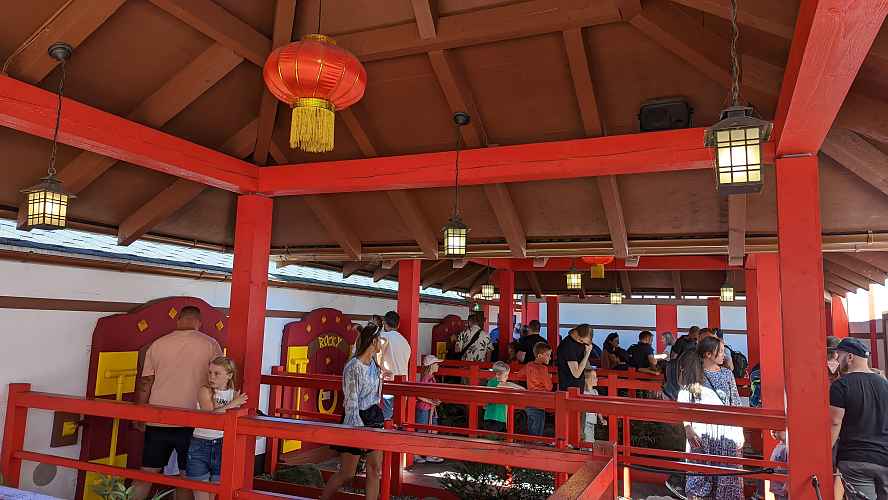 The queue is a number of pagoda and dojo themed rooms and courtyards.