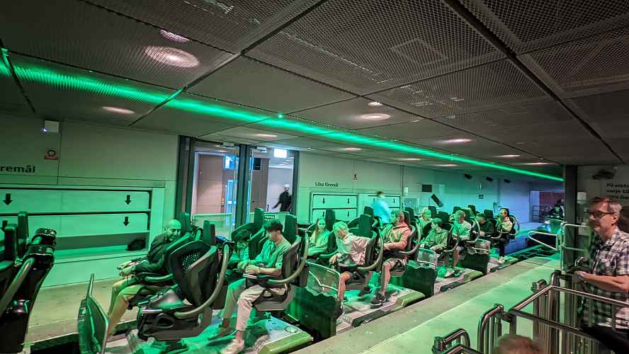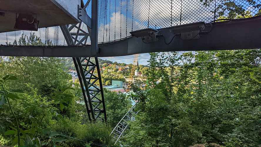 The queue passes under the station, where you can see the mechanism for the load gates.