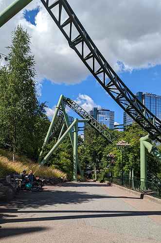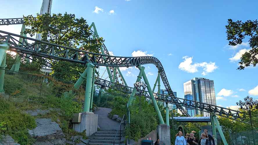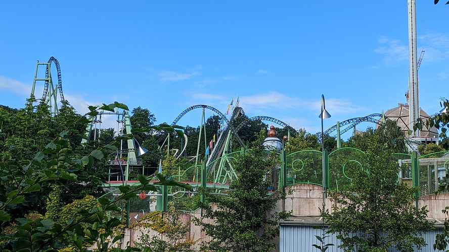 The first launch (lower left) leads into another corkscrew, a diving turn, airtime hill, followed by another diving turn.