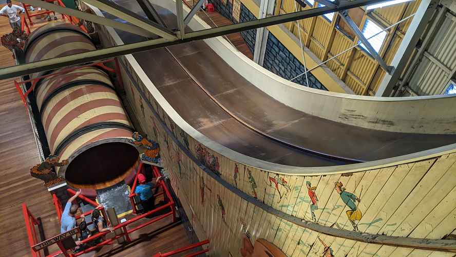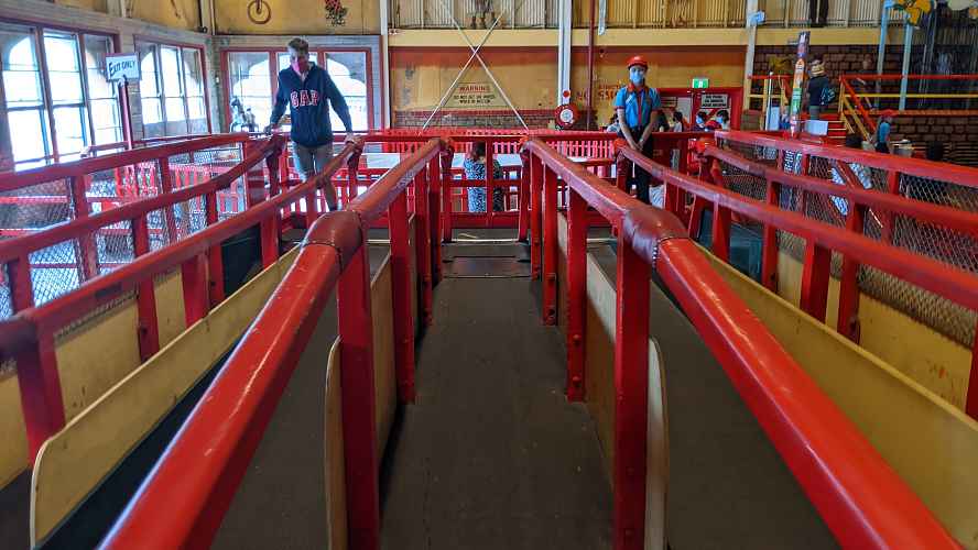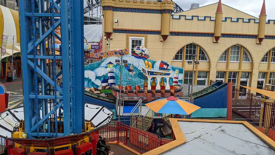 The first half of the ride sits on the roof of the dodgems building, which previously held the Tumble Bug ride.