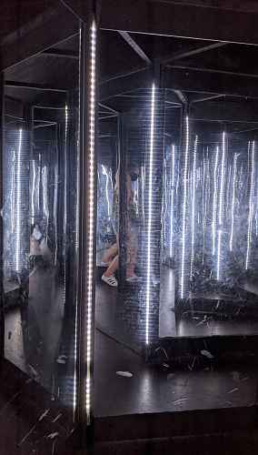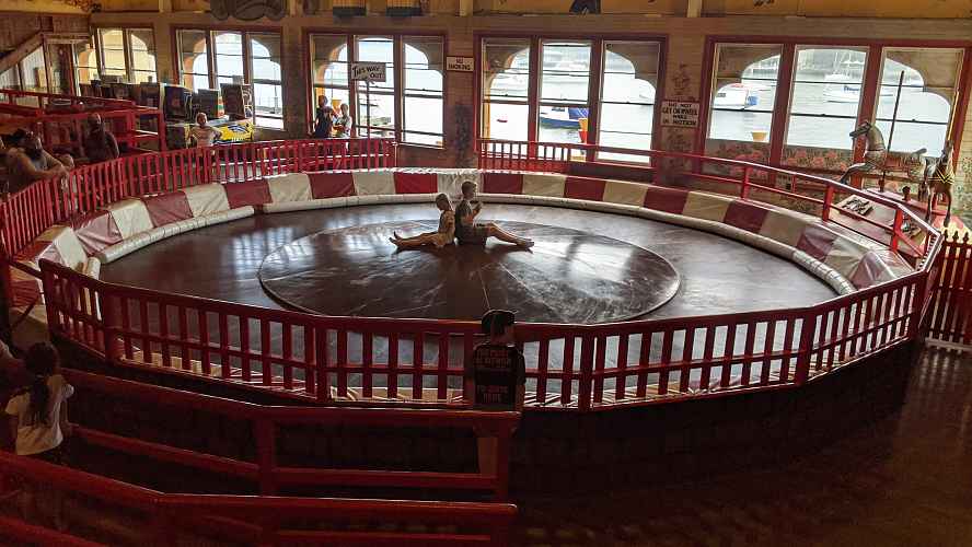 On the joy wheel, guests must try to remain seated on smooth polished spinning wheel. The speed increases, until you can no longer hold yourself in place, at which point you are flung off onto the padding around the outside.