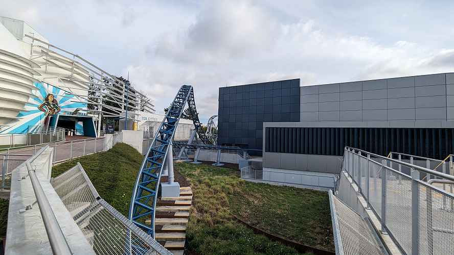 The first launch leads to an airtime hill and a dive under the entrance bridge.