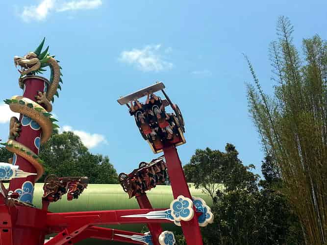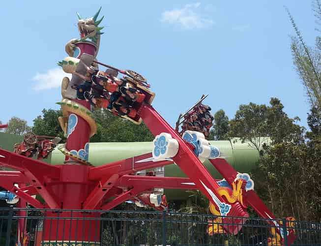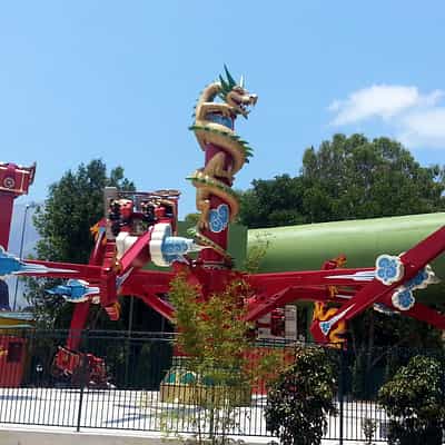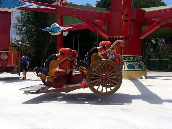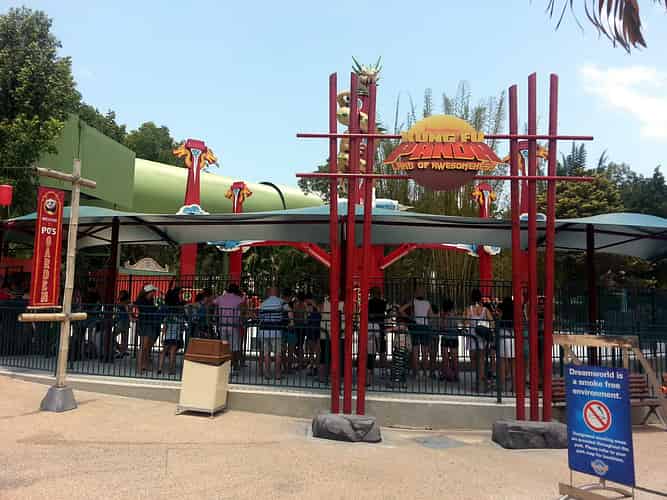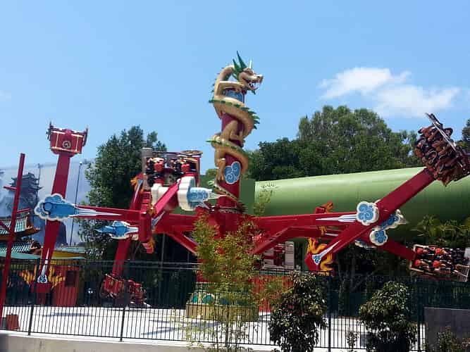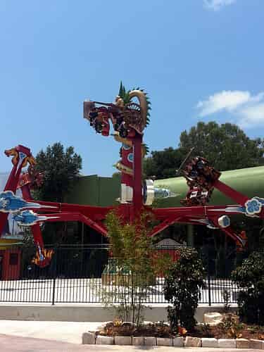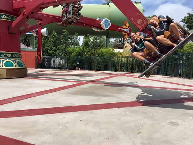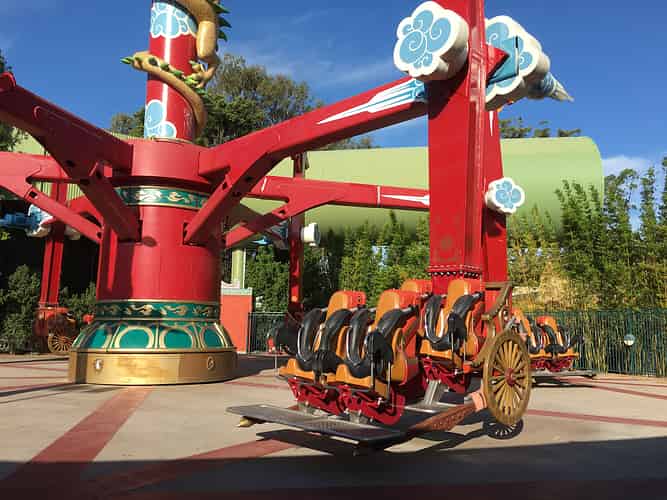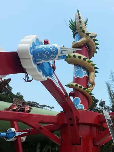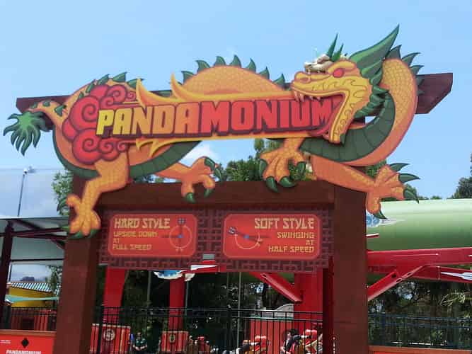 Pandamonium is the flagship attraction of the Kung Fu Panda Land of Awesomness. Guests ride in one of 6 Rickshaws that swing 360 degrees sideways, whilst revolving around a central hub.