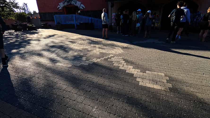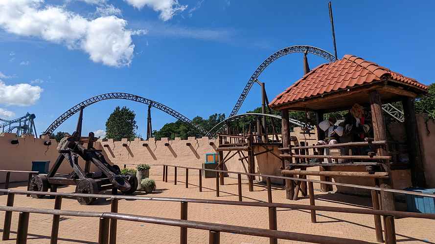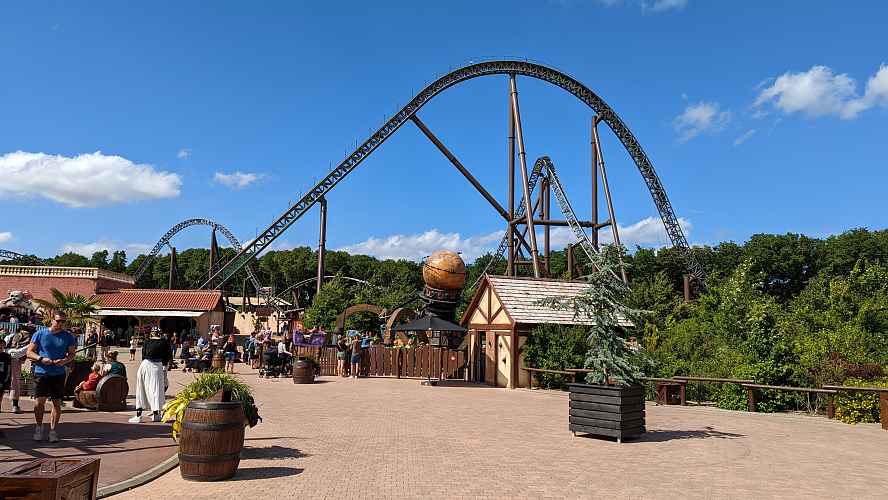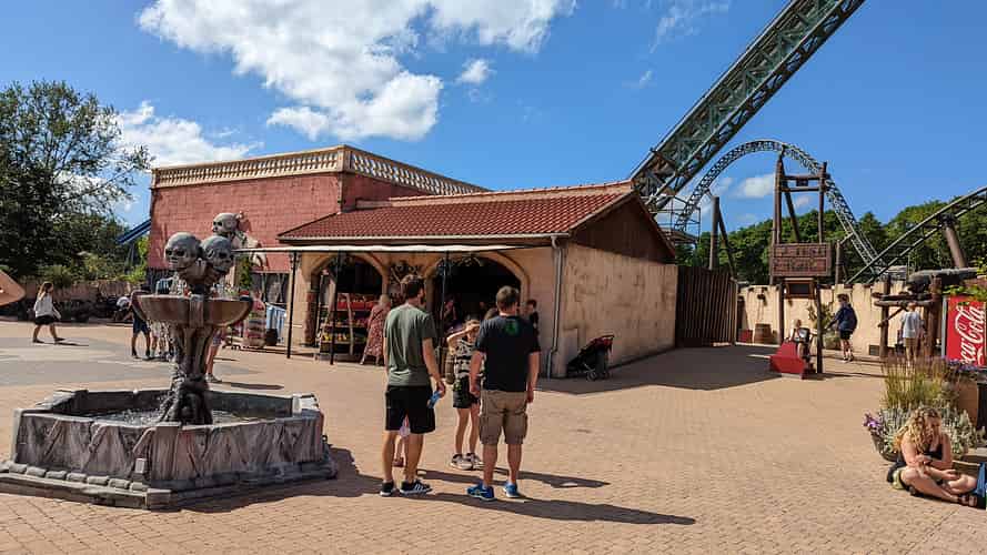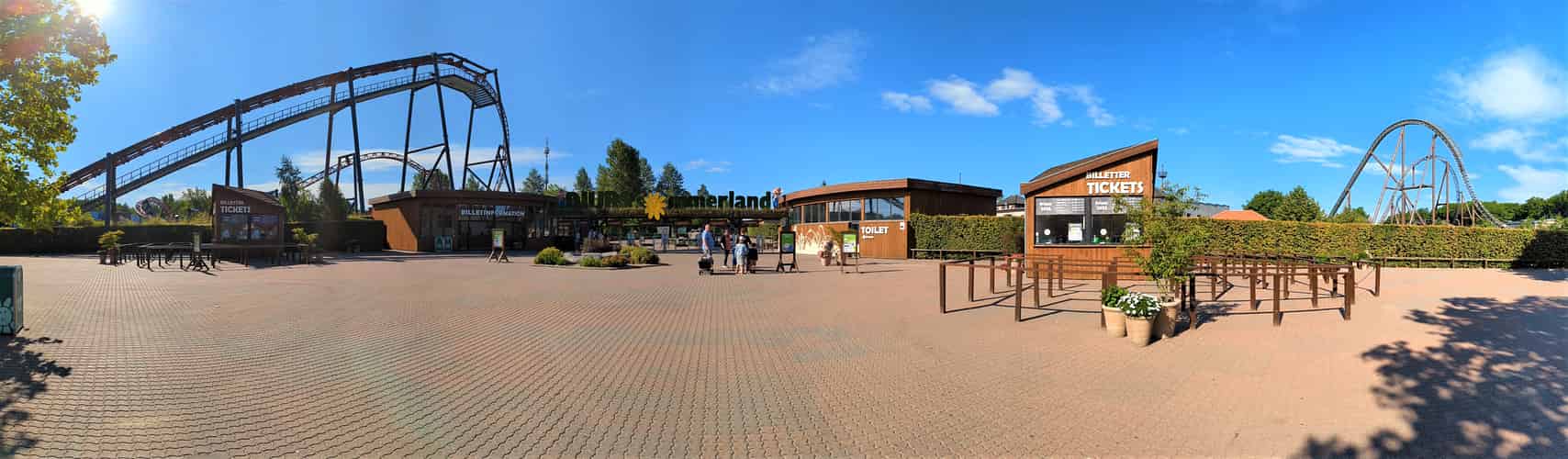 A panorama of the entry plaza, framed by DrageKongen and Piraten.