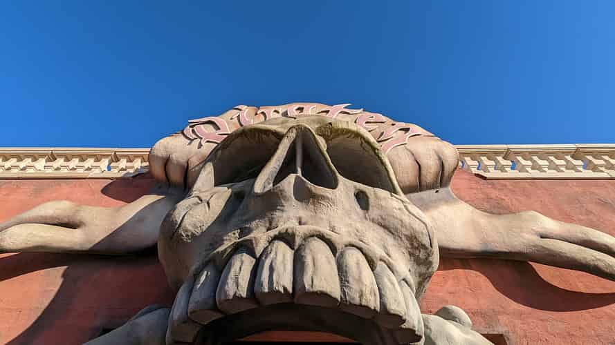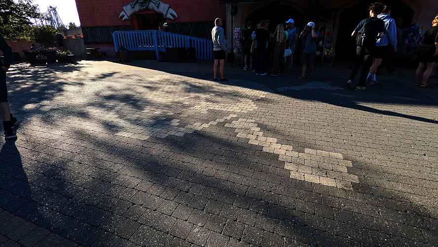 The queue is in a courtyard behind the station, complete with animatronics and large props.