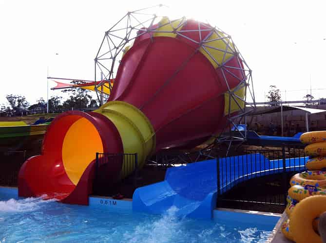 Double Bowlseye is a Proslide Behemoth Bowl 40. Rafts spiral down two consecutive toilet bowls, though unlike the typical situation in Sydney riders are washed into a swimming pool rather than Bondi Beach.