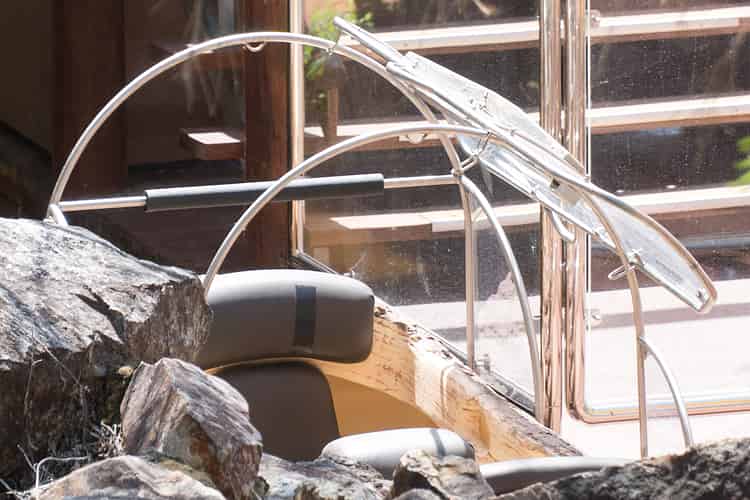The awnings slide to either side, loosely fixed to the arched frame with four u-shaped brackets. The steel mechanism along the top of the of the awning locks into the eyes welded at the top of each arch. When down in this side position, the entire weight of the frame is rested on the tip of just one of the rather flimsy-looking u-shaped brackets in the back corner.