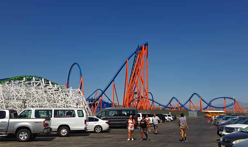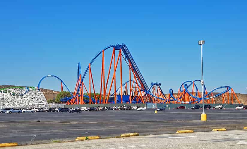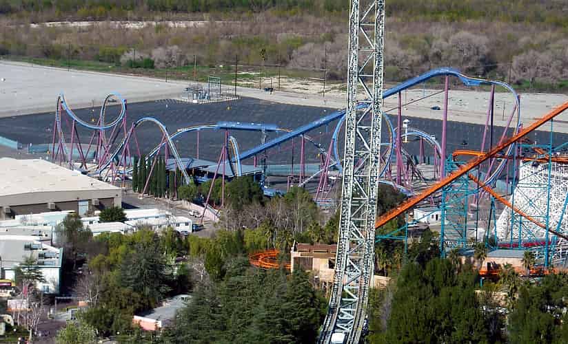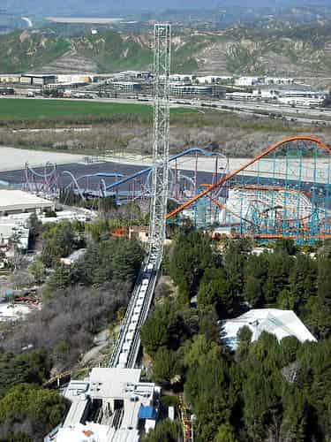 From left to right we can see Superman: The Escape, some water slide towers that belong to Hurricane Harbour, Goliath, Collossus, and Scream!