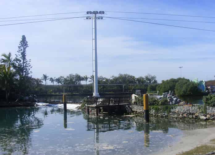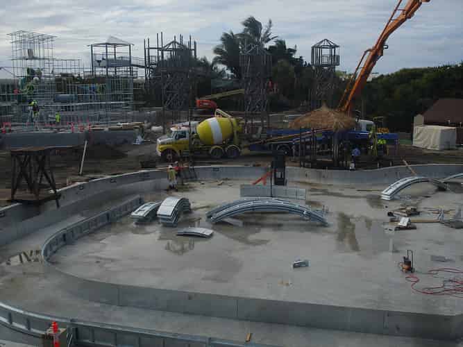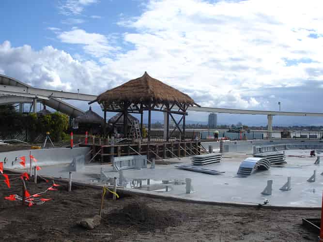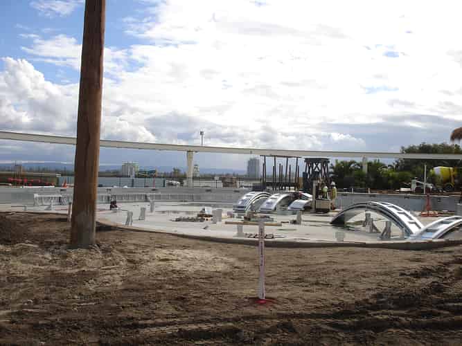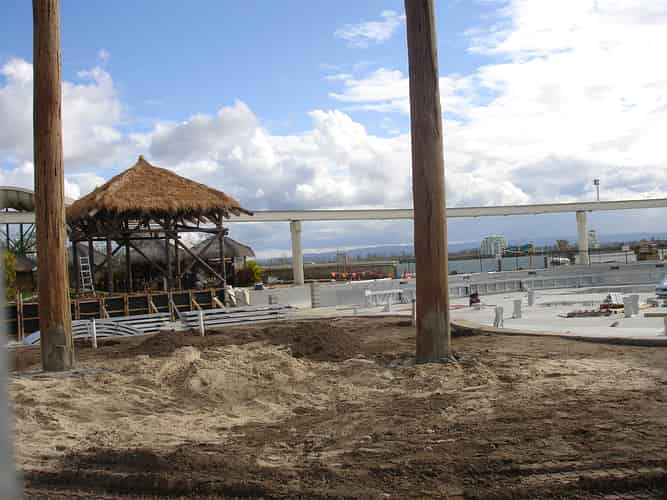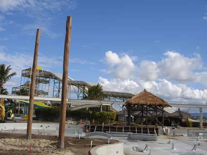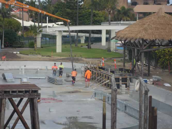 In preparation for the launch of Pirates Unleashed, Sea World moved the Endeavour replica from one of the dolphin pools, into the ski lake in June 2009. Rocks were temporarily removed to assist the move. This photo was taken after the rocks had been replaced.