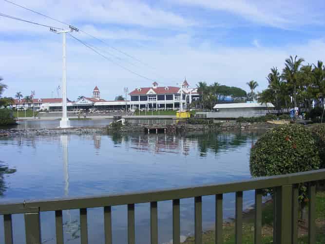 A panorama of the ski lake. At the time this photo was taken, the Endeavour replica was docked on the left hand side to aid in the preparation for Pirates Unleashed.