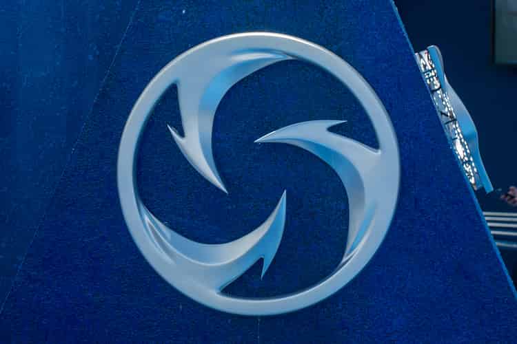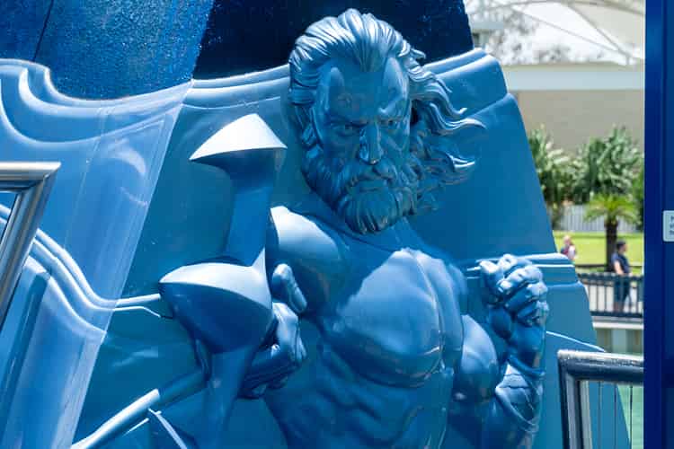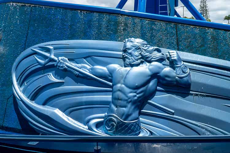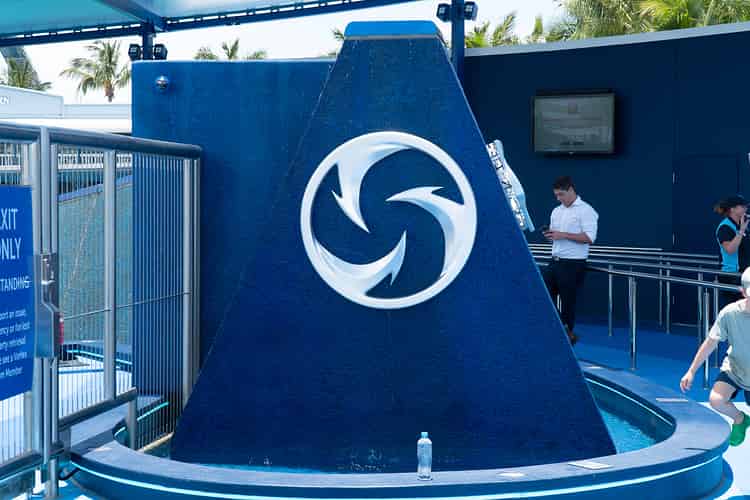The ride's theming consists of several water feature walls and several embellishments such as this Vortex icon.