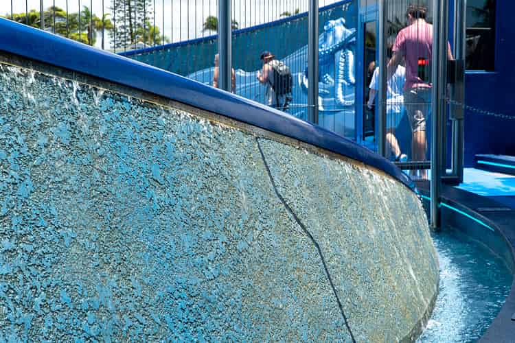 The jarring juxtaposition between the graceful sweeping 'wave wall' and the abrupt stainless steel fences that secure the ride perimeter is somewhat ill-conceived. A solution that combined the requirements for a safe ride with a cohesive atmosphere would have been far more welcome.