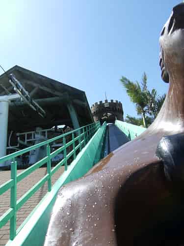 As is fast becoming a standard on Intamin rides, Jet Rescue features separate load and unload stations.The screens play a short clip of Trevor Long (Director of Marine Sciences at Sea World) congratulating you on your successful rescue.
