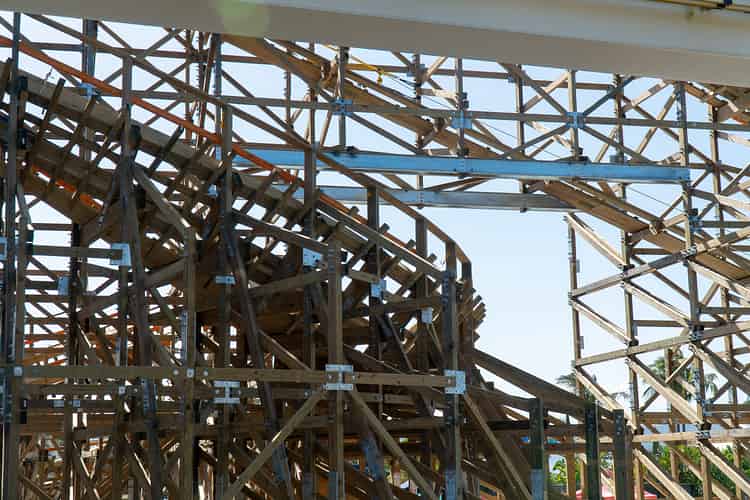 These orange wooden beams are locally sourced unlike the rest of the ride's muted pine look. It's a bold accent that's unique to Leviathan.