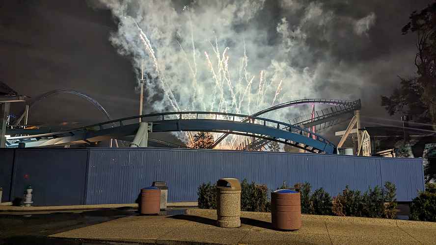 Fireworks erupt behind Pipeline: The Surf Coaster.