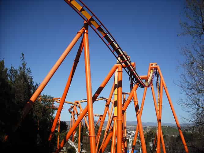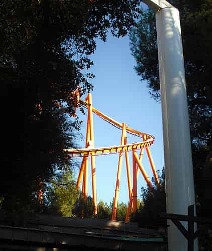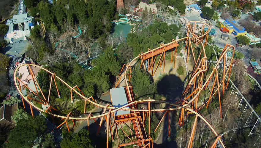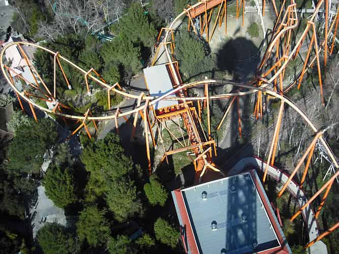 Here you can see one of Magic Mountains newest attractions soaring over one of its classics.